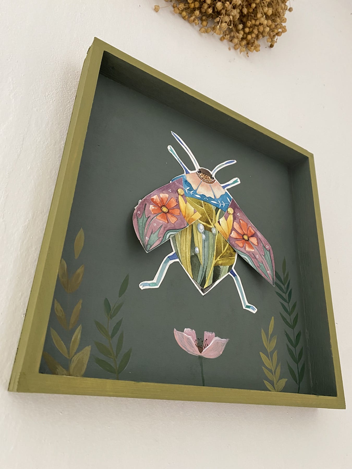Brouk je papírový, malovaný akvarelem a vlepený do dřevěnného rámu ( bez skla), který je malovaný akrylovými barvami. Rám je otíratelný, papírová ilustrace snese lehké a optarné očištění prachovkou nebo suchým hadříkem ( nikdy ne vlhkým či přímo mokrým, barvy by se rozpily).