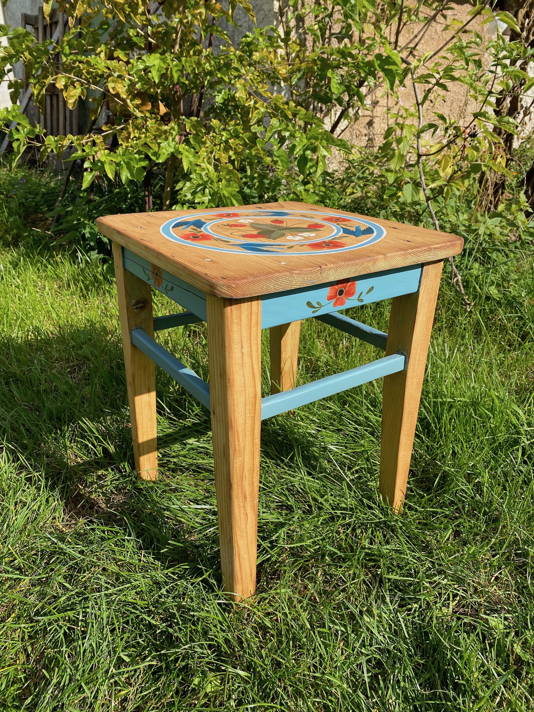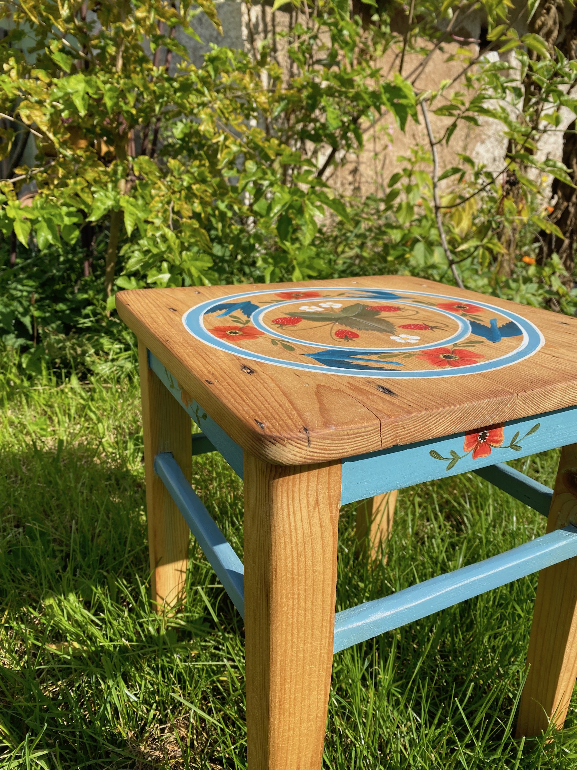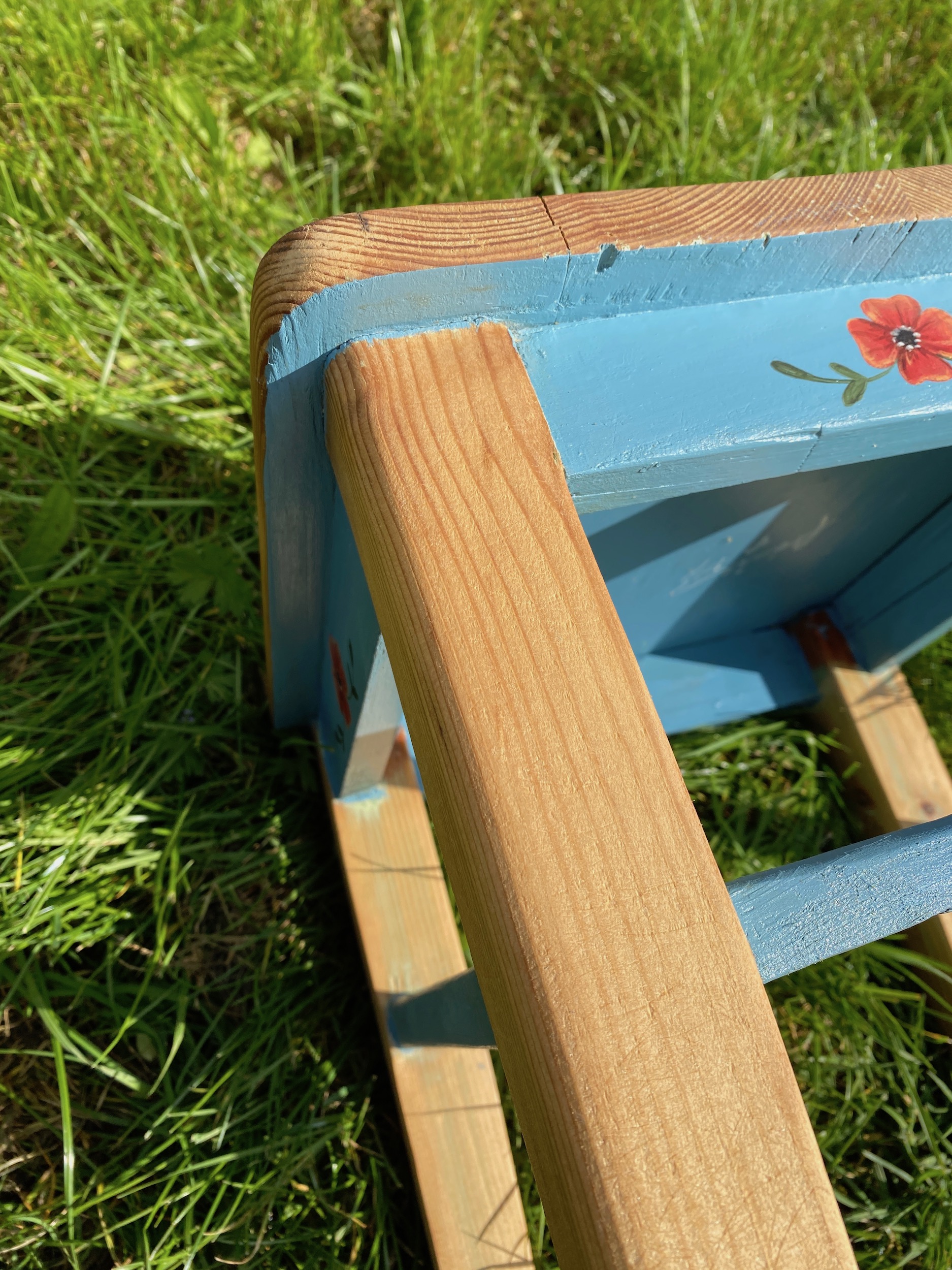 Stoličku jsem po obroušení pomalovala vlastním originálním motivem, přesně v aduším stylu. Barvy jsem použila akrylové, které na dřevu dobře drží a po zaschnutí jsou voděodelné. Nakonec jsme vše zatřela přírodním ekologickým olejem na dřevo. Stolička je tak celá omyvatelná.
