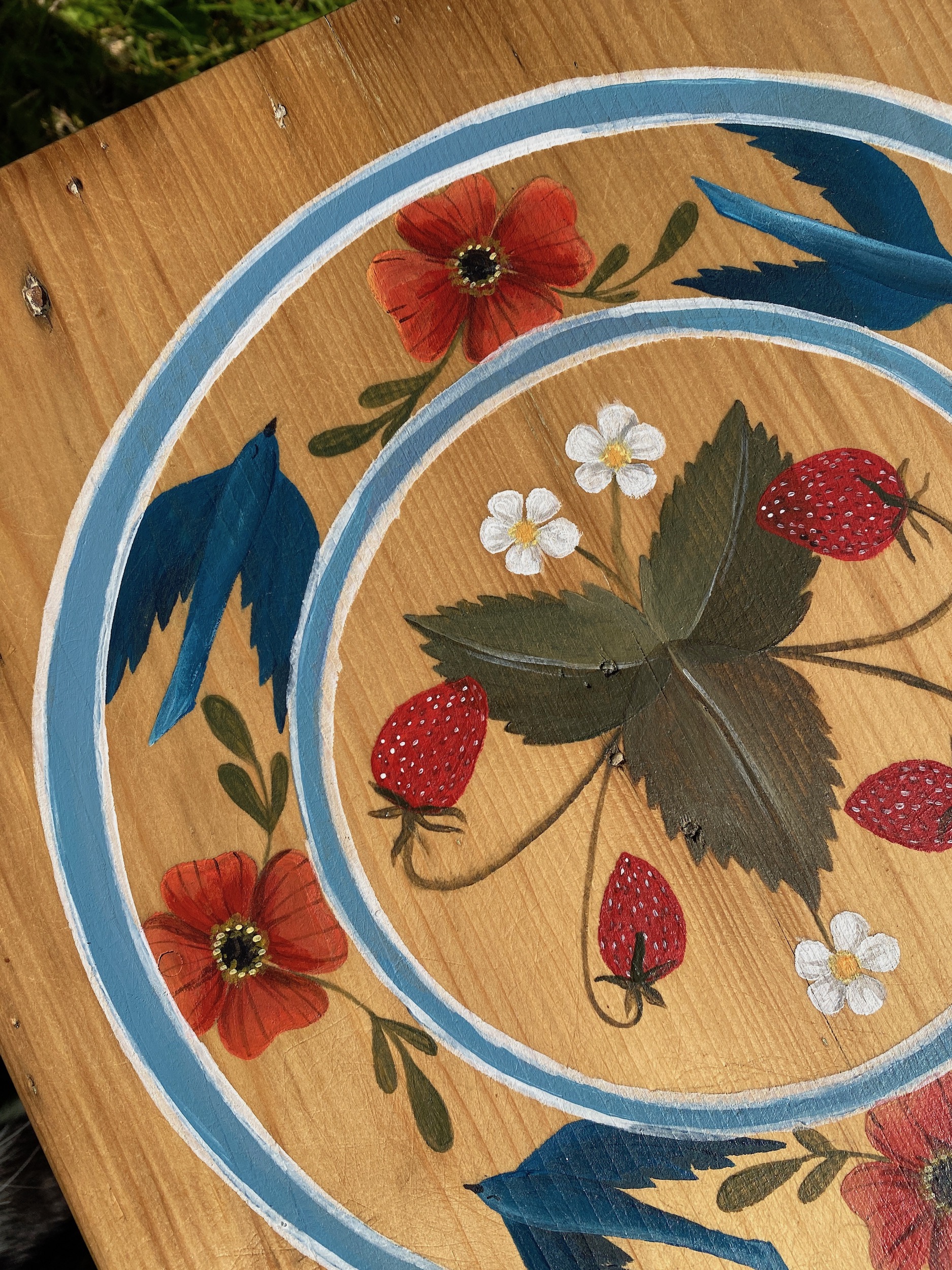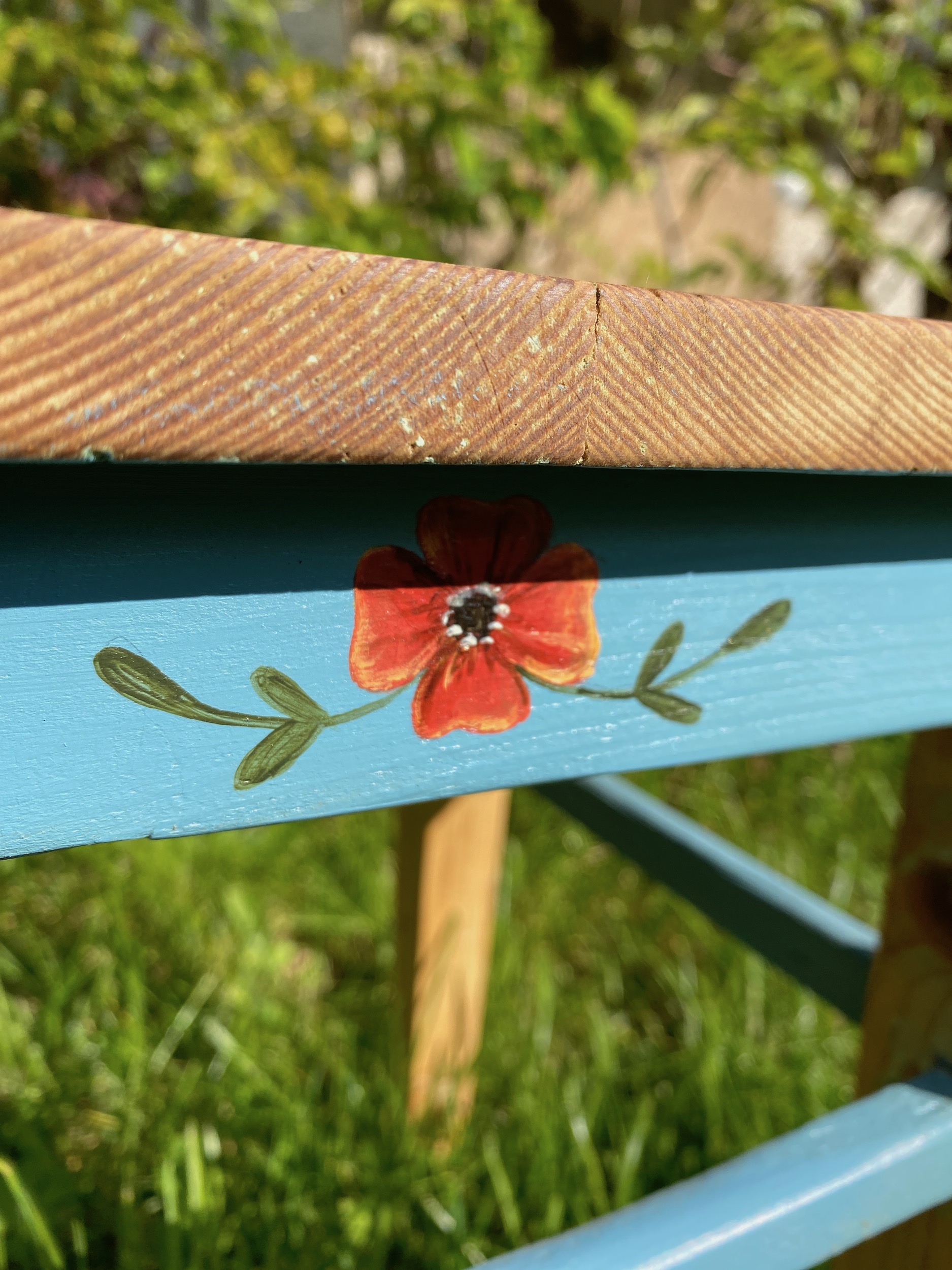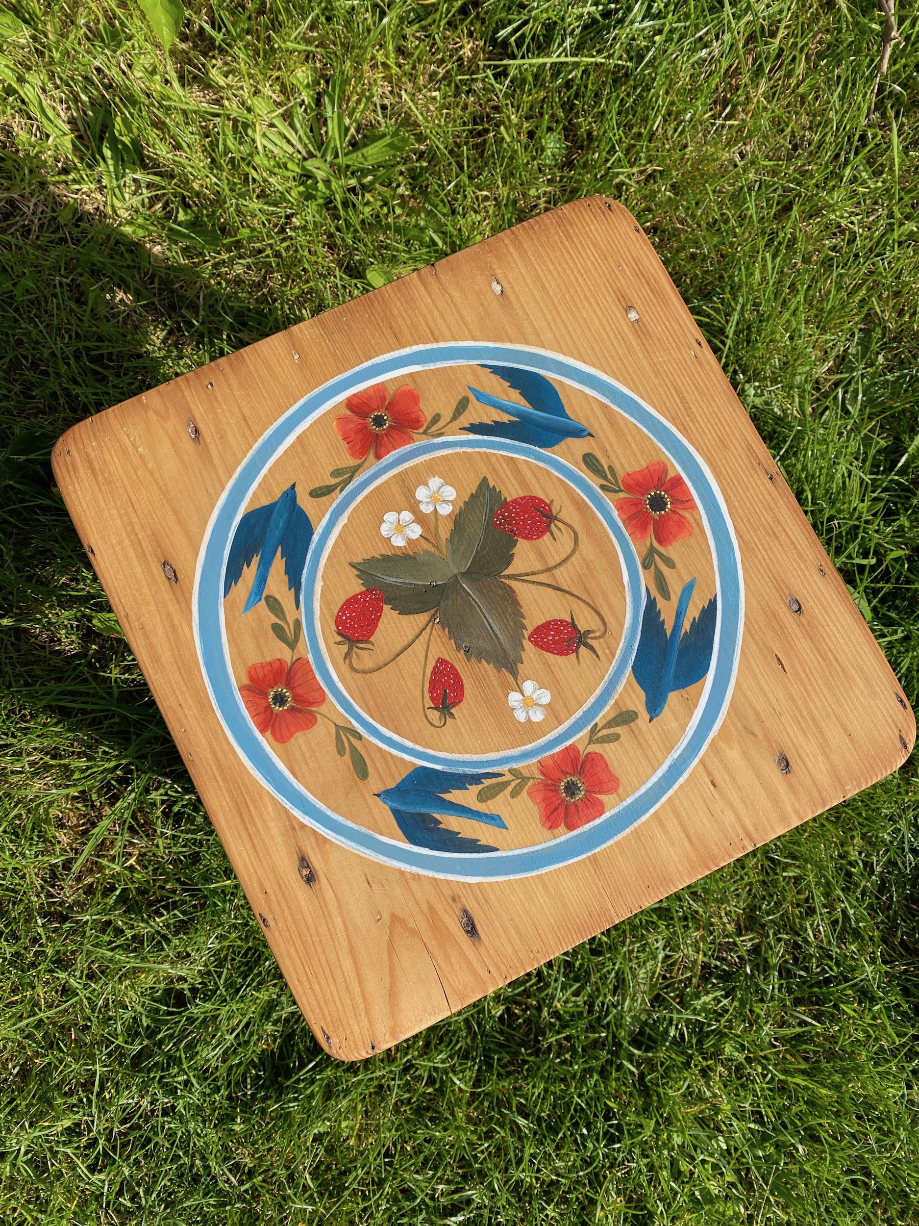 Stoličku jsem po obroušení pomalovala vlastním originálním motivem, přesně v aduším stylu. Barvy jsem použila akrylové, které na dřevu dobře drží a po zaschnutí jsou voděodelné. Nakonec jsme vše zatřela přírodním ekologickým olejem na dřevo. Stolička je tak celá omyvatelná.