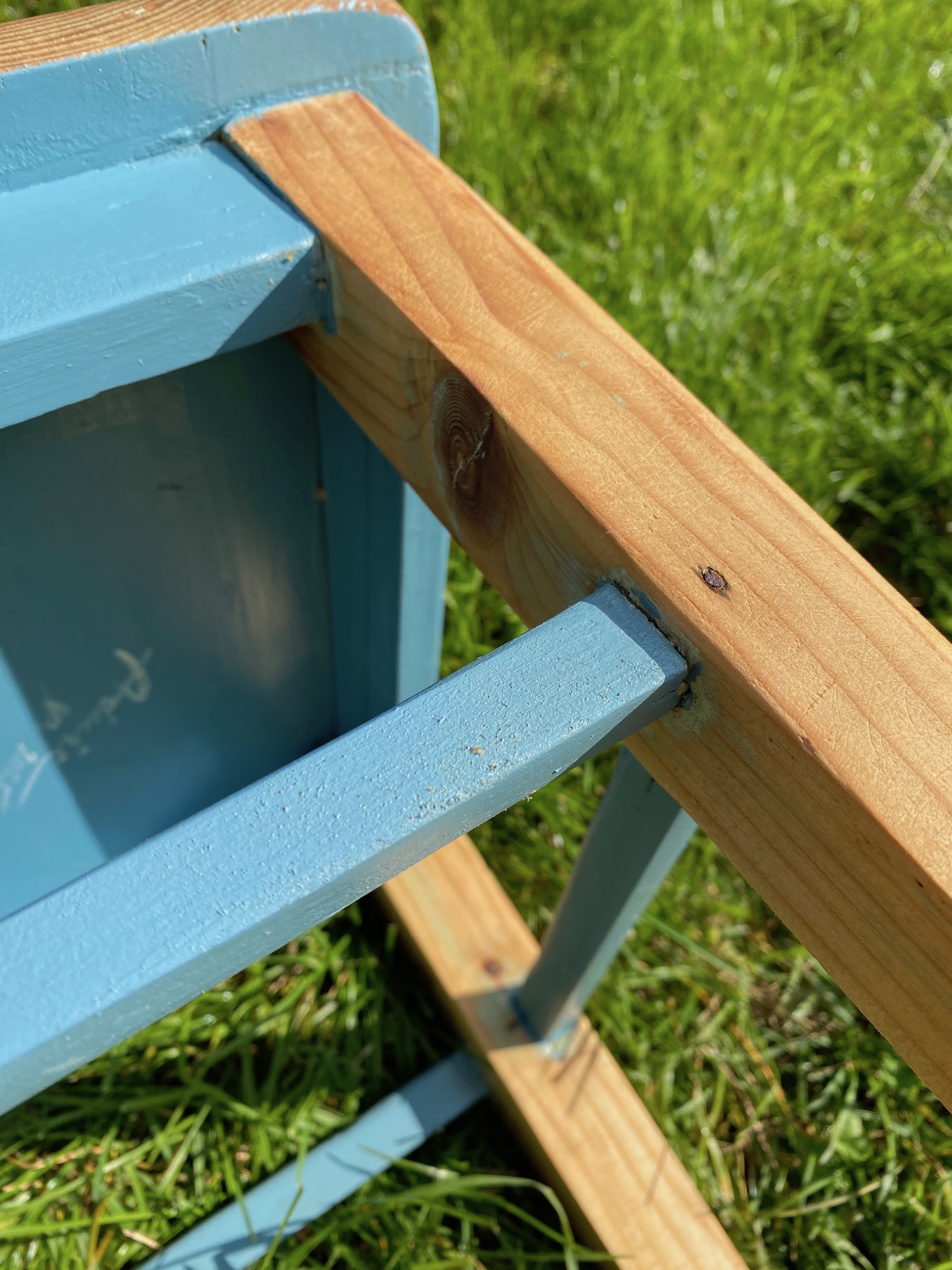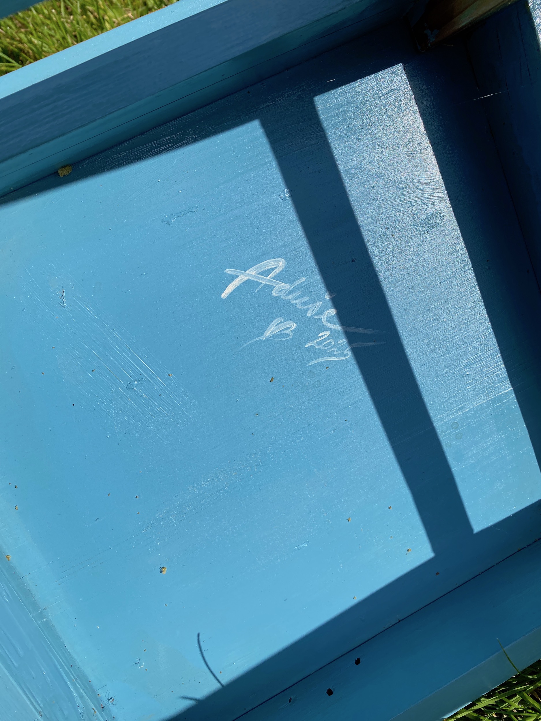 Nebyla v nejlepším stavu, byla celá špinavá, natřená zelinkavou emilovou barvou. No bylo na ní vidět, že má něco za sebou. A tak jsem doma vzala špachtli, horkovzdušnou pistoly a barvu nejdřív seškrábala dolů, potom přišla na řadu bruska a brousila a brousila. Dřevo pod nánosem barvy bylo naštěstí cajk a vypadlo dobře, nejevilo známky žádného požírače dřeva.