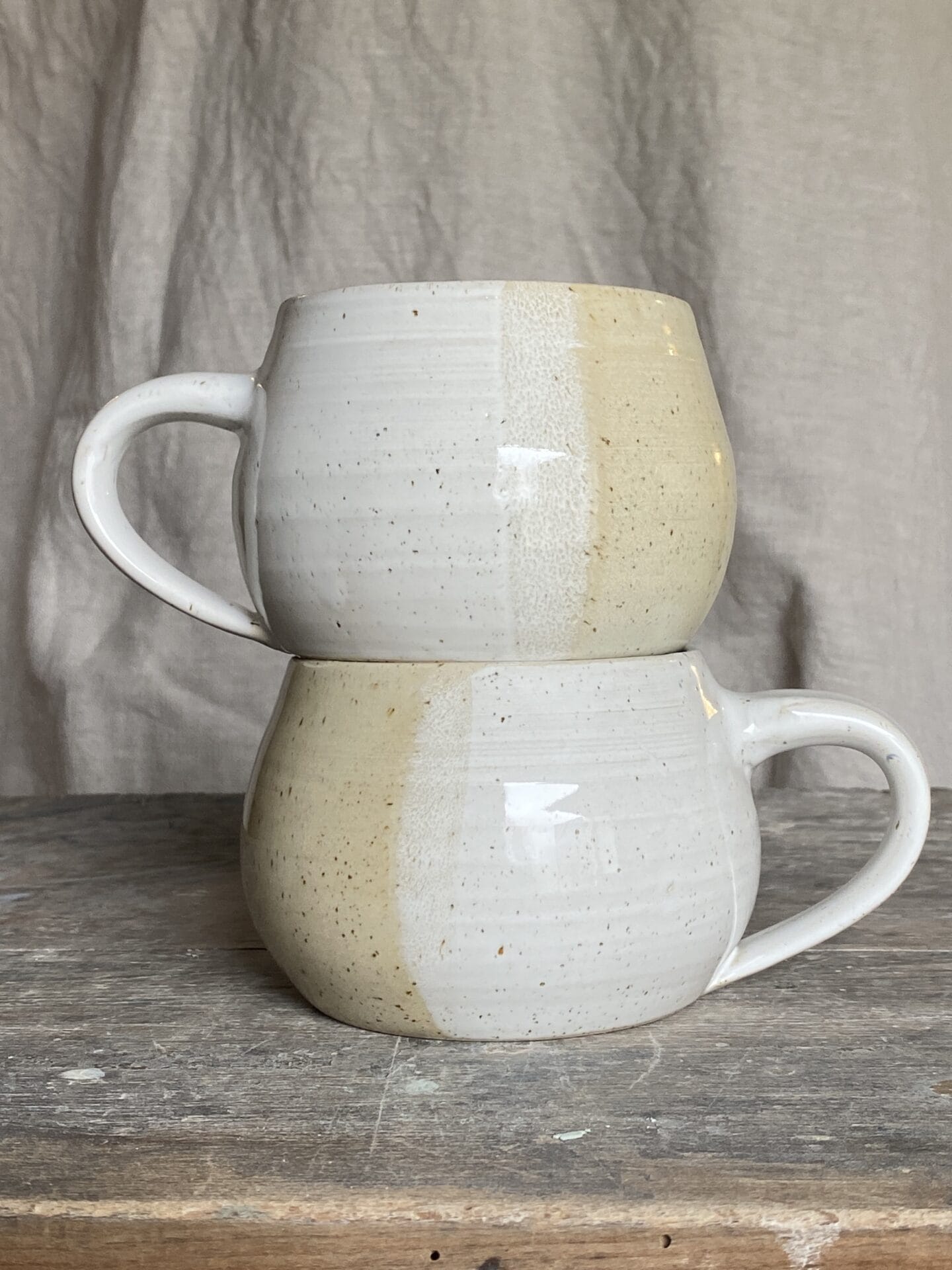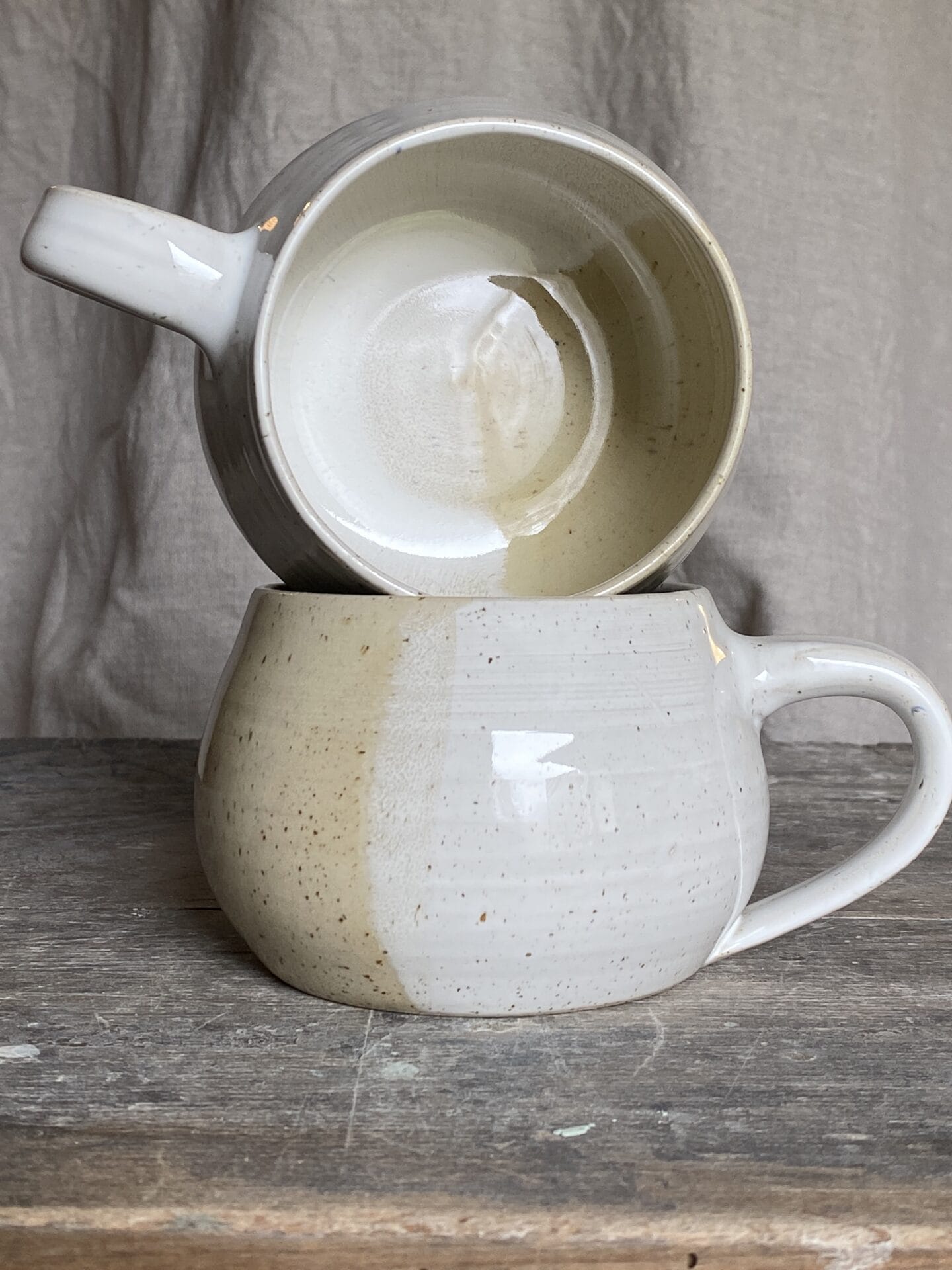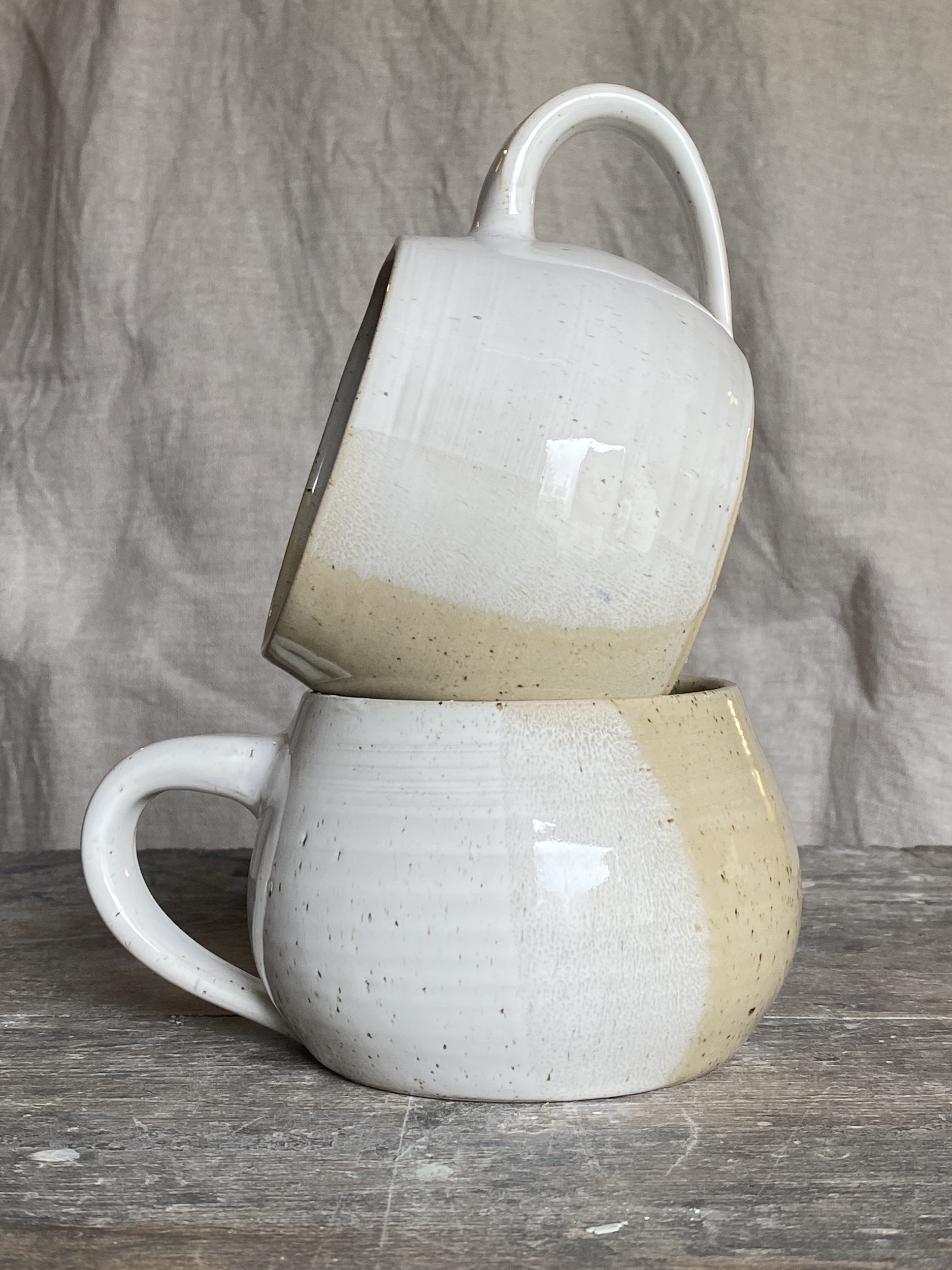 Velký keramický hrnek z tečkované hlíny, buclatý tvar. Glazury jsou použity dvě, obě atestované a obě dohromady dávají hrníčku jemný dotyk přírody.