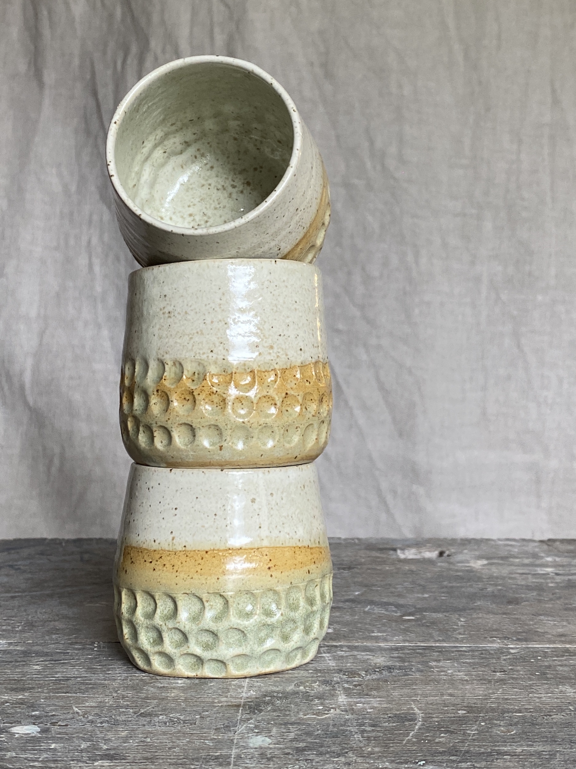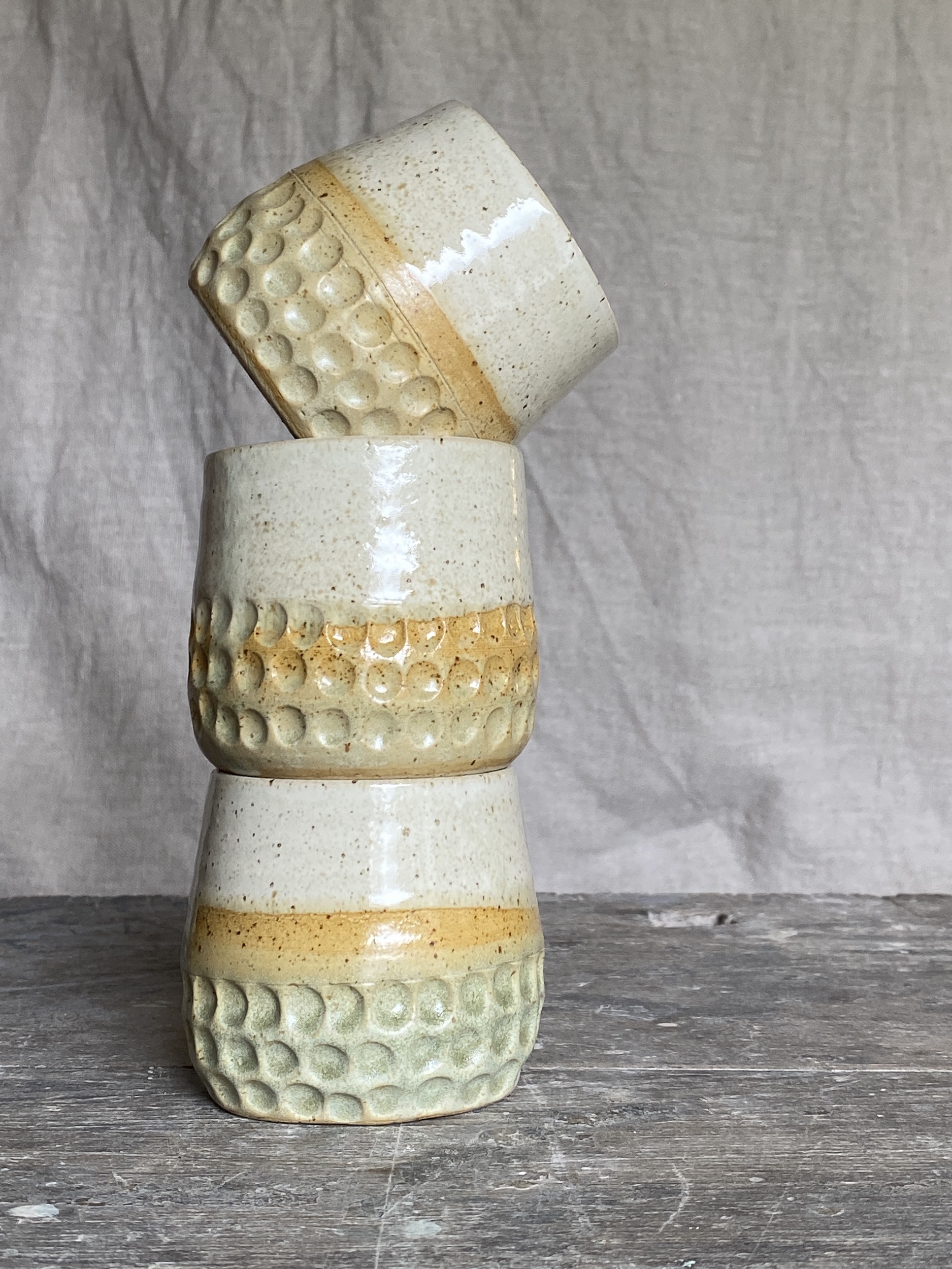 Keramický kalíšek na dvojité espresso či kakao, čaj, cokoliv co máte rádi, z tečkované hlíny, ručně zdobený tečkováním. Glazury jsou použity dvě, obě atestované a obě dohromady dávají hrníčku jemný dotyk přírody.