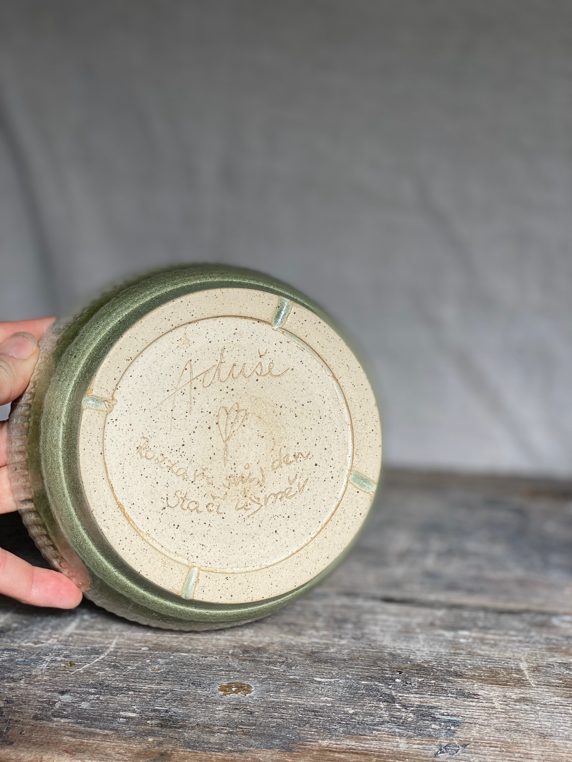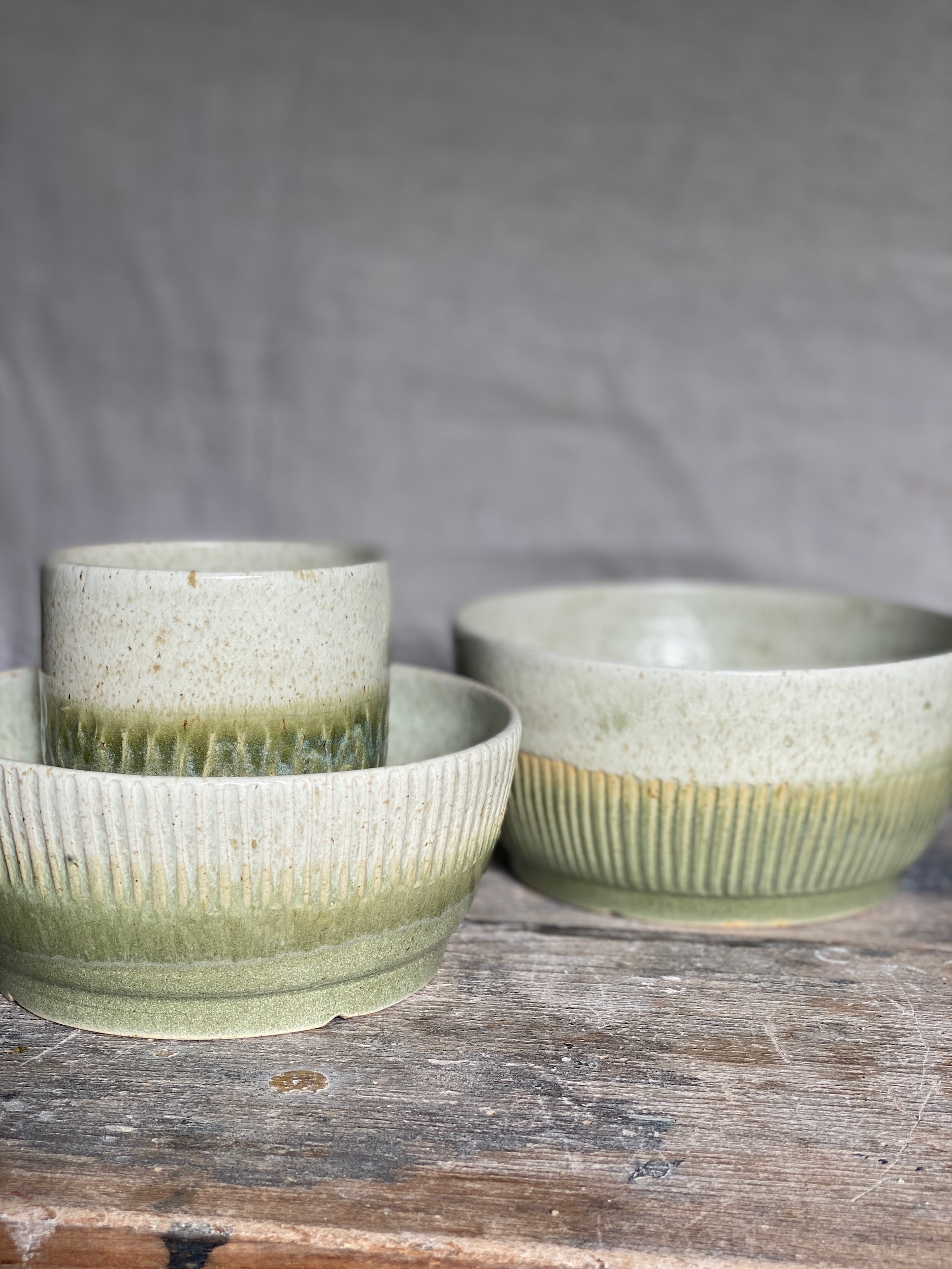Nižší keramická miska s krásnou texturou glazury. Dva odstíny zelené, které dohromady tvoří dokonalé kombo. Miska je zdobená rýhovaním na horní části.
