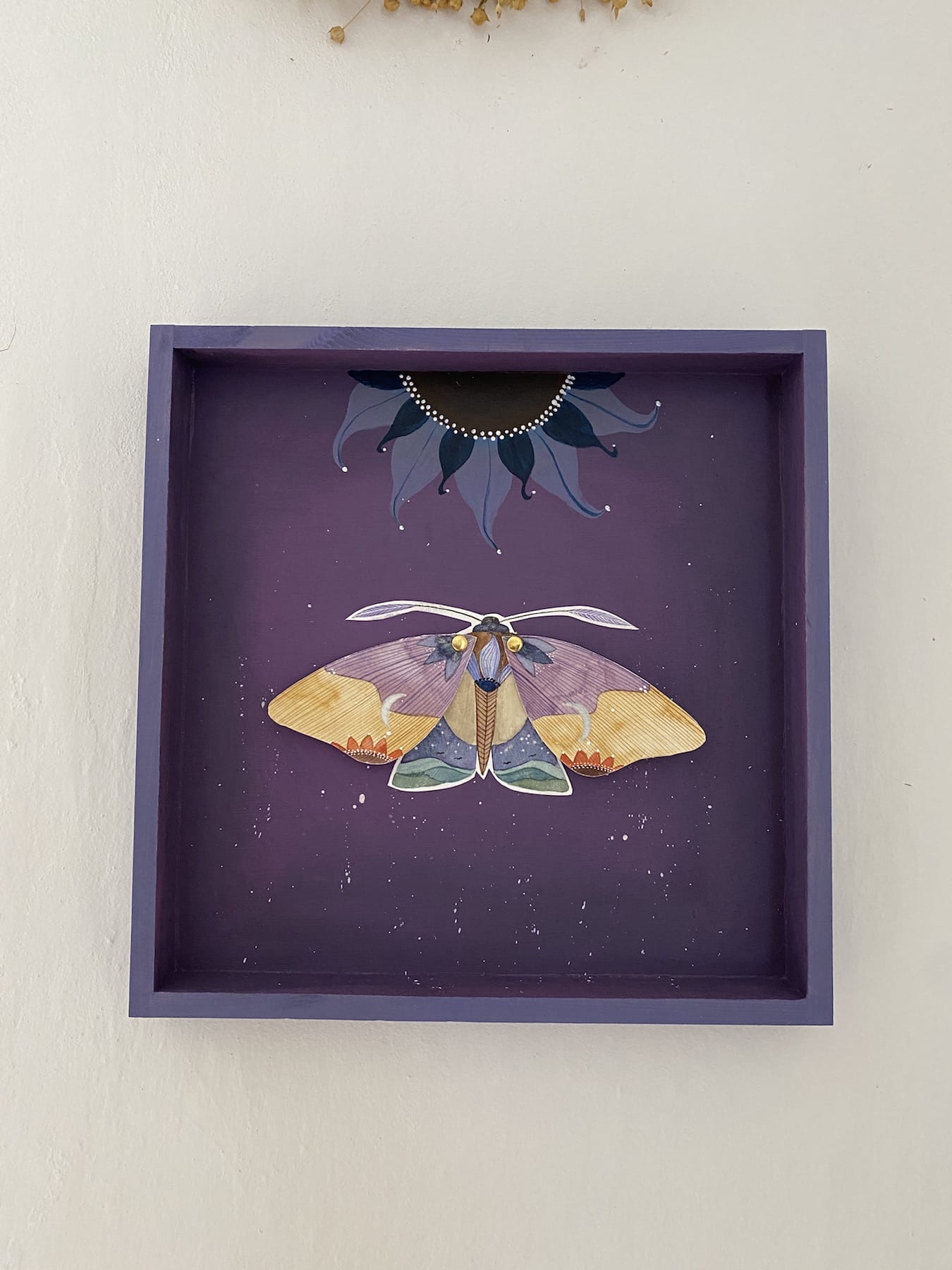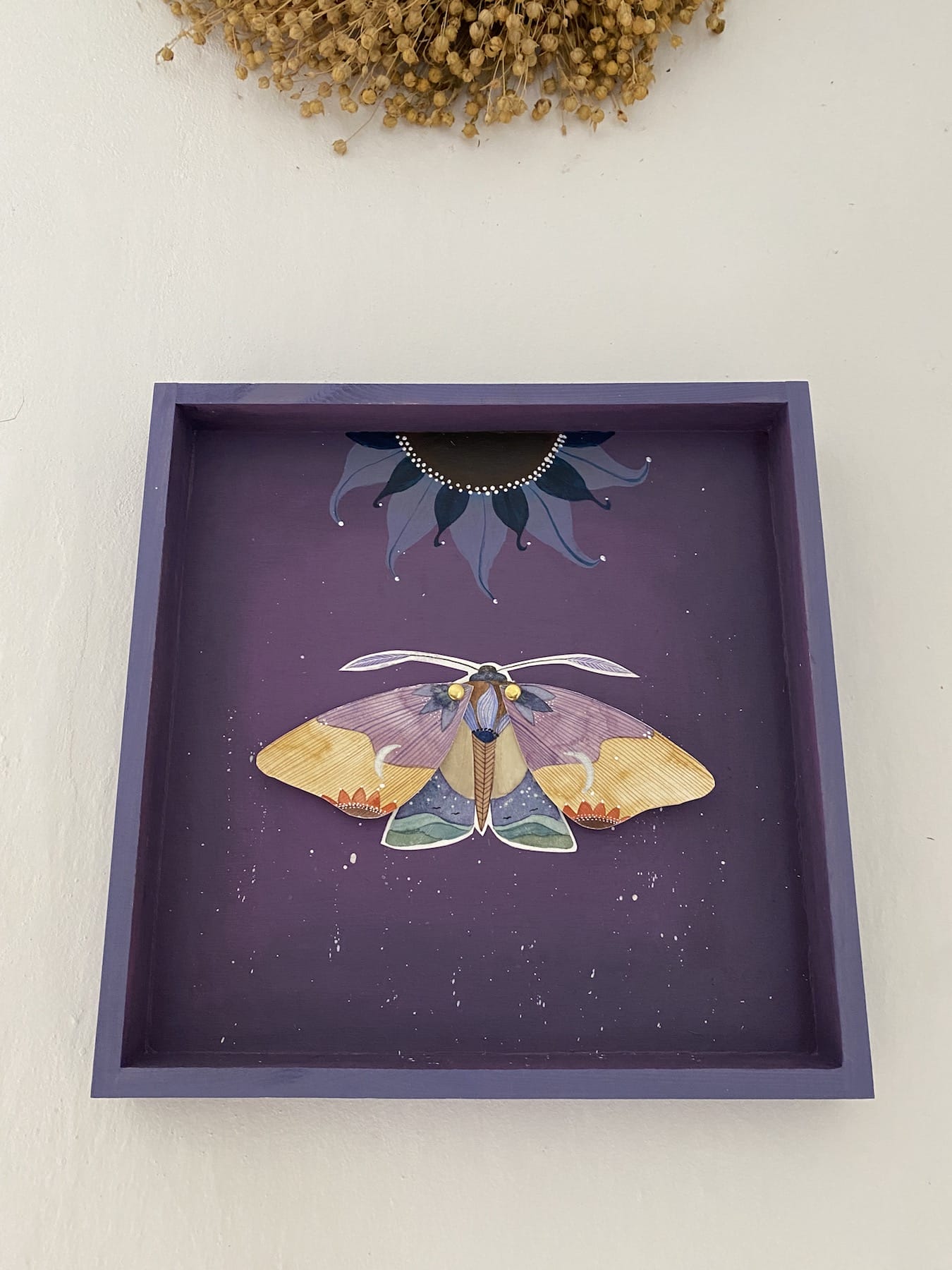 Můrka je papírová, malovaná akvarelem a vlepená do dřevěnného rámu ( bez skla), který je malovaný akrylovými barvami. Rám je otíratelný, papírová ilustrace snese lehké a optarné očištění prachovkou nebo suchým hadříkem ( nikdy ne vlhkým či přímo mokrým, barvy by se rozpily).