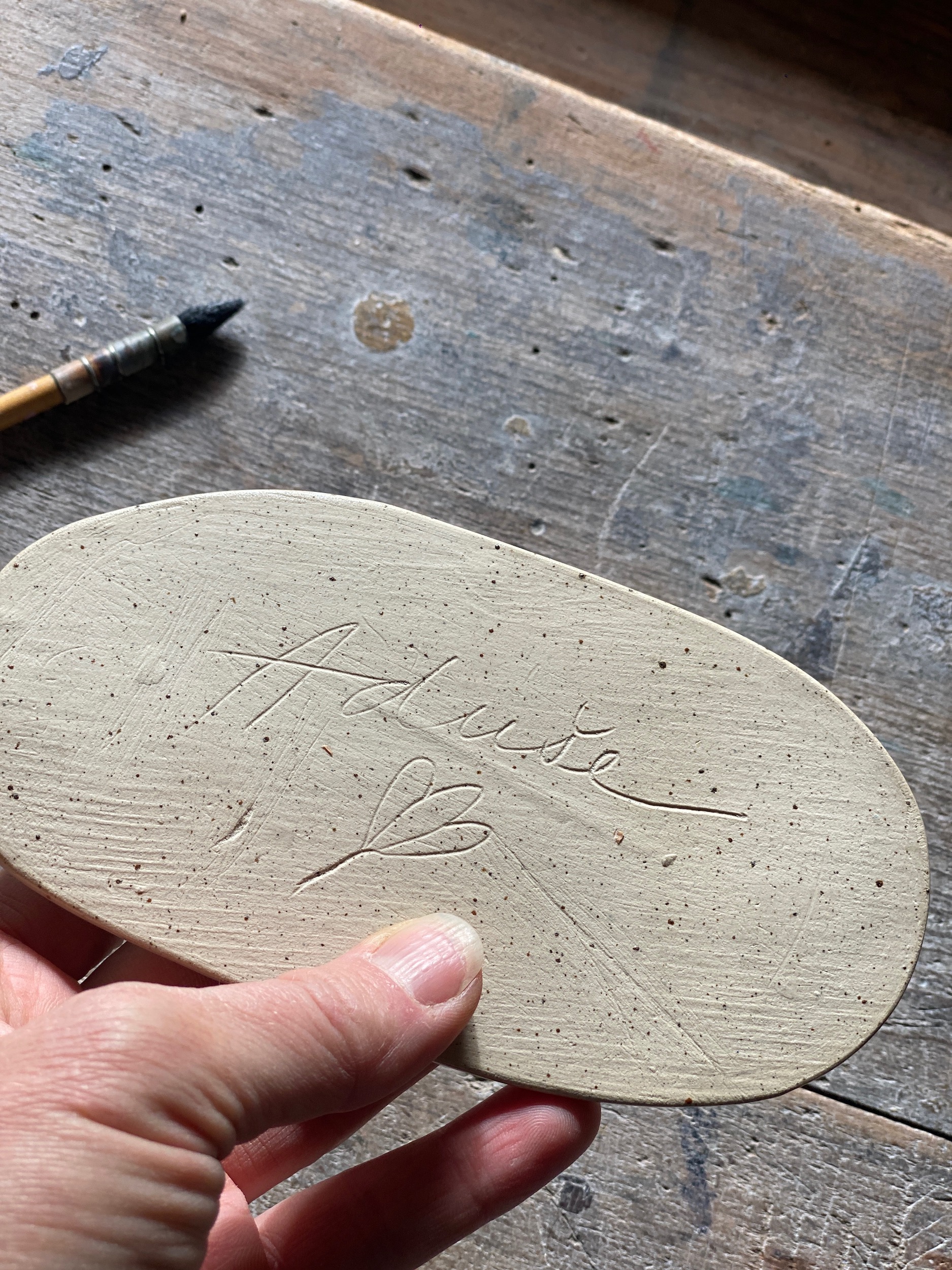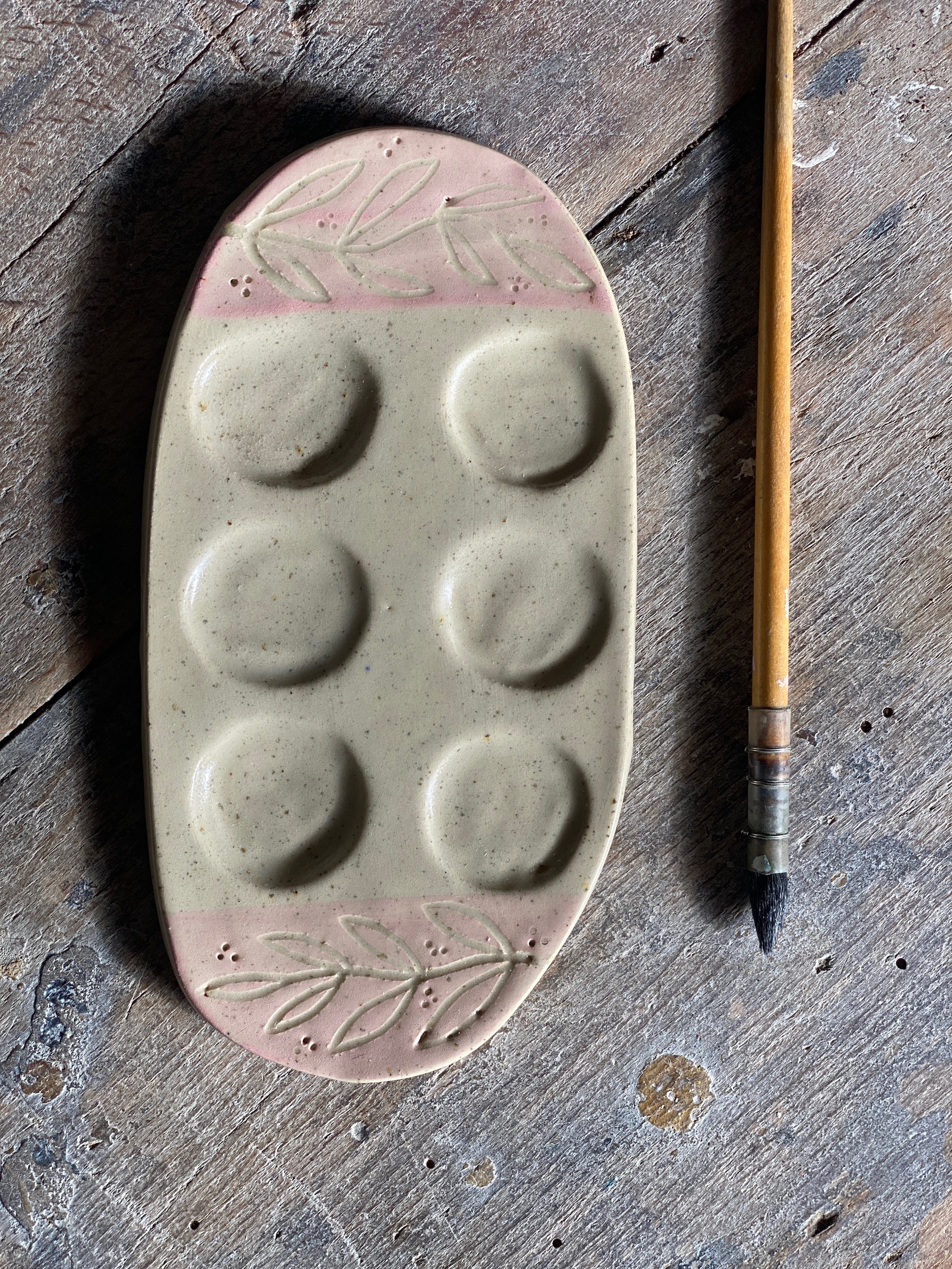 Ručně tvořená keramická paletka z tečkované hlíny a přeglazovaná matnou transparetní glazurou.