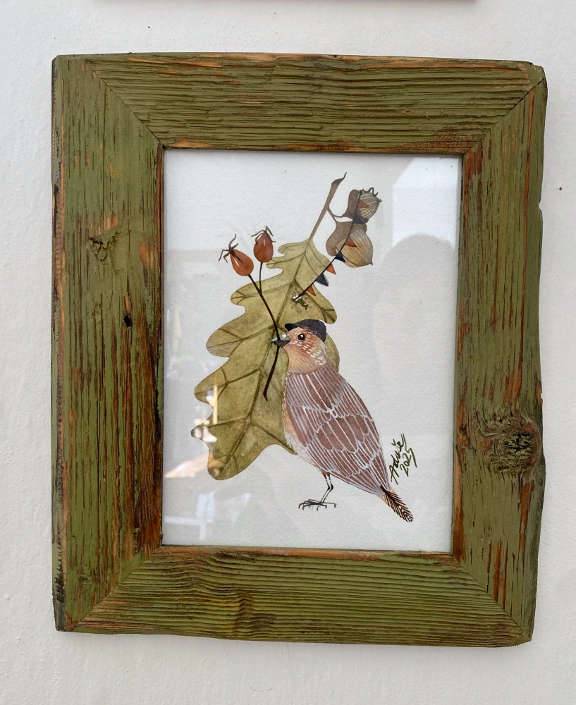 Obraz malovaný technikou akvarelu a zarámovaný v dřevěnném rámu, vyrobeného ze starých prken v zelené barvě. Celkově obrázek i rám k sobě moc hezky ladí a nádech podzimní hřejivé radosti, ketrý v sobě obrázek nese, rám ještě více podtrhuje.